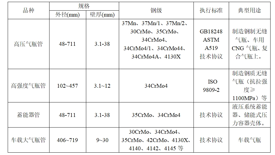 用于制造钢制无缝气瓶、车用CNG气瓶、复合气瓶。我心博·心博(中国)官方网生产的高压气瓶管为管制瓶制造提供优 质的热轧薄壁无缝钢管,具有内外表面质量好、壁厚均匀、质量轻、生产率和成材率高、成本低等优点,便于无缝管制瓶瓶底收口的关键技术的应用,使气瓶管的制 造从采用钢坯经冲孔拉拨转向采用薄壁无缝钢管制造,并已成为发展趋势,深受用户欢迎。